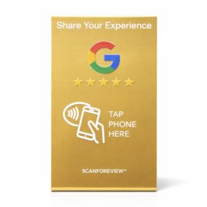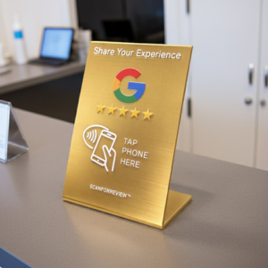 The Gold NFC Google Review Stand is designed for businesses that value presentation. Its eye-catching metallic finish adds a refined touch while making review collection effortless.