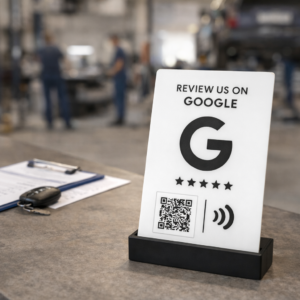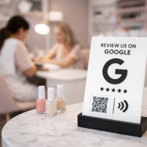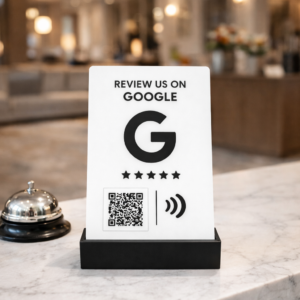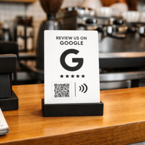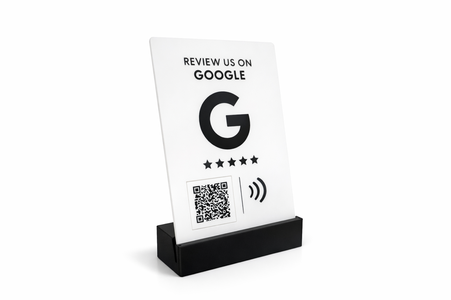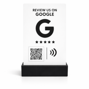 Turn happy customers into real Google reviews with this sleek White & Black Google Review NFC Stand with QR Code.