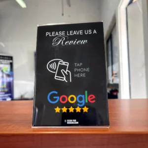 Make it easy for customers to share their experiences with the Please Leave A Google Review Stand NFC Scan – 4×6 inches – Black Background. This compact, modern display stand features NFC technology, enabling customers to simply tap their iPhone or Android device on the stand to access your Google review page instantly. The bold black background provides a professional look that makes the stand a stylish addition to any business setting.