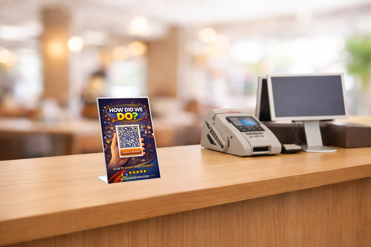 Please Rate Us – QR Code Review Stand – Front Desk Display